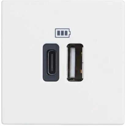 5 Vdc USB charger TYPE A and C for quick charge of one single electronic device (mobile phones, smartphones,tablets or similar) up to 3000 mA or simultaneouscharging of two devices up to 1500 mA- 110÷230 Va.c. 50÷60 Hz power supply - 2 modules - white