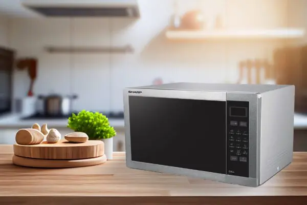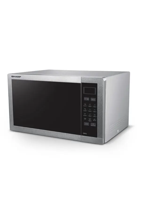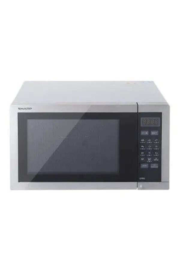 ميكروويف شارب بسعة 34 لتر مع ميكروويف 900 واط، شواية 1000 واط، 5 مستويات طاقة، 8 برامج أوتوماتيكية، صينية دوارة 315 ملم، شاشة رقمية، مؤقت تذويب، وقفل أمان للأطفال — مثالي ومدمج للاستخدام اليومي.